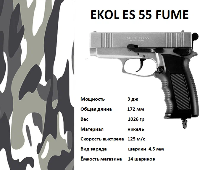 Пистолет пневм. EKOL ES 55 FUME, (никель) кал. 4,5 мм, 3 Дж
